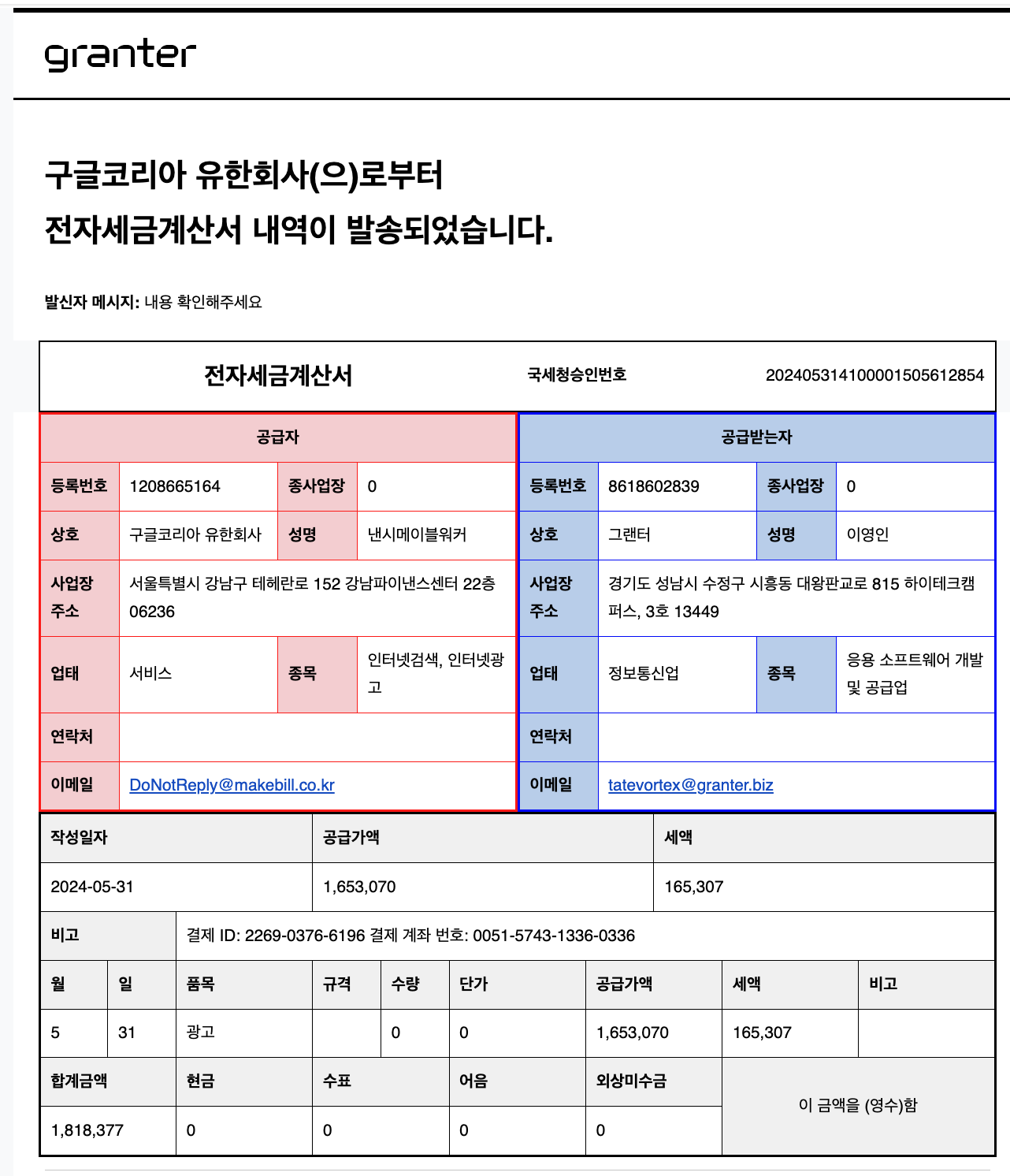 내역이 전송되면 아래와 같이 상대방은 메시지와 함께 세금계산서 이메일을 다시 받아볼 수 있게 됩니다.