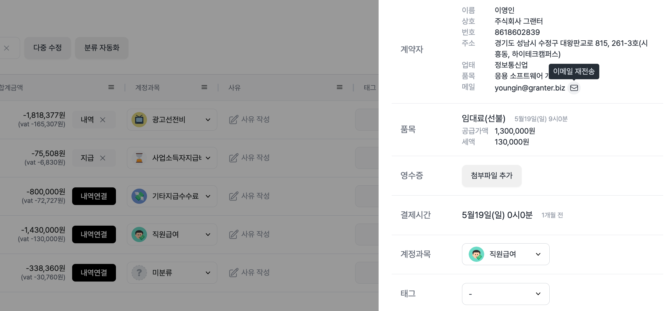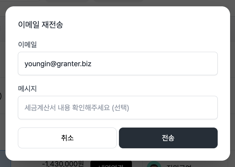 이메일 재전송 버튼을 누르게 되면 특정 메시지와 함께 세금계산서 내역을 원하는 사람의 메일로 전송할 수 있어요