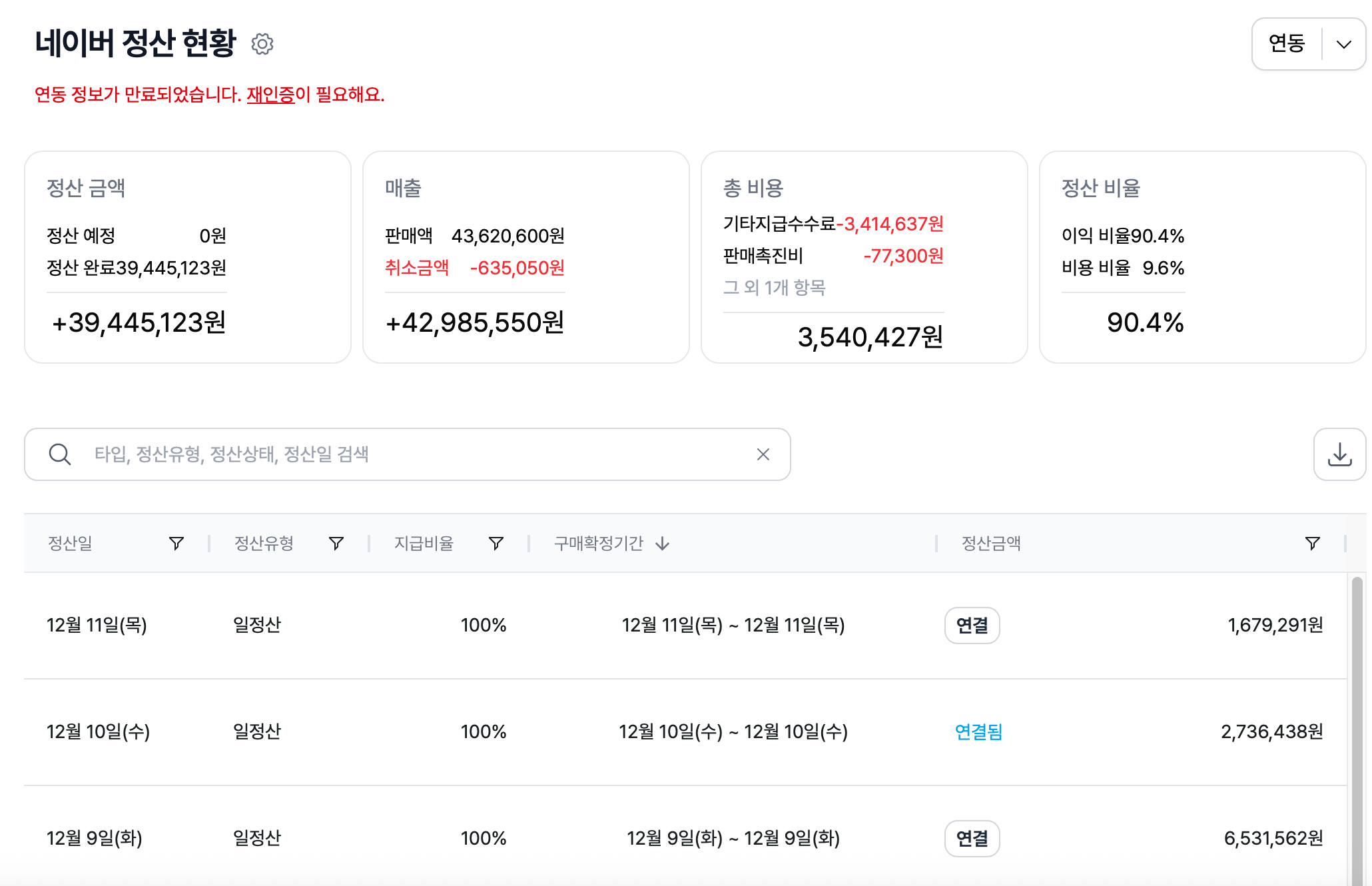 결제 데이터를 기반으로 매출, 수수료, 정산 금액을 자동으로 불러와서 한 번에 확인 가능해요.