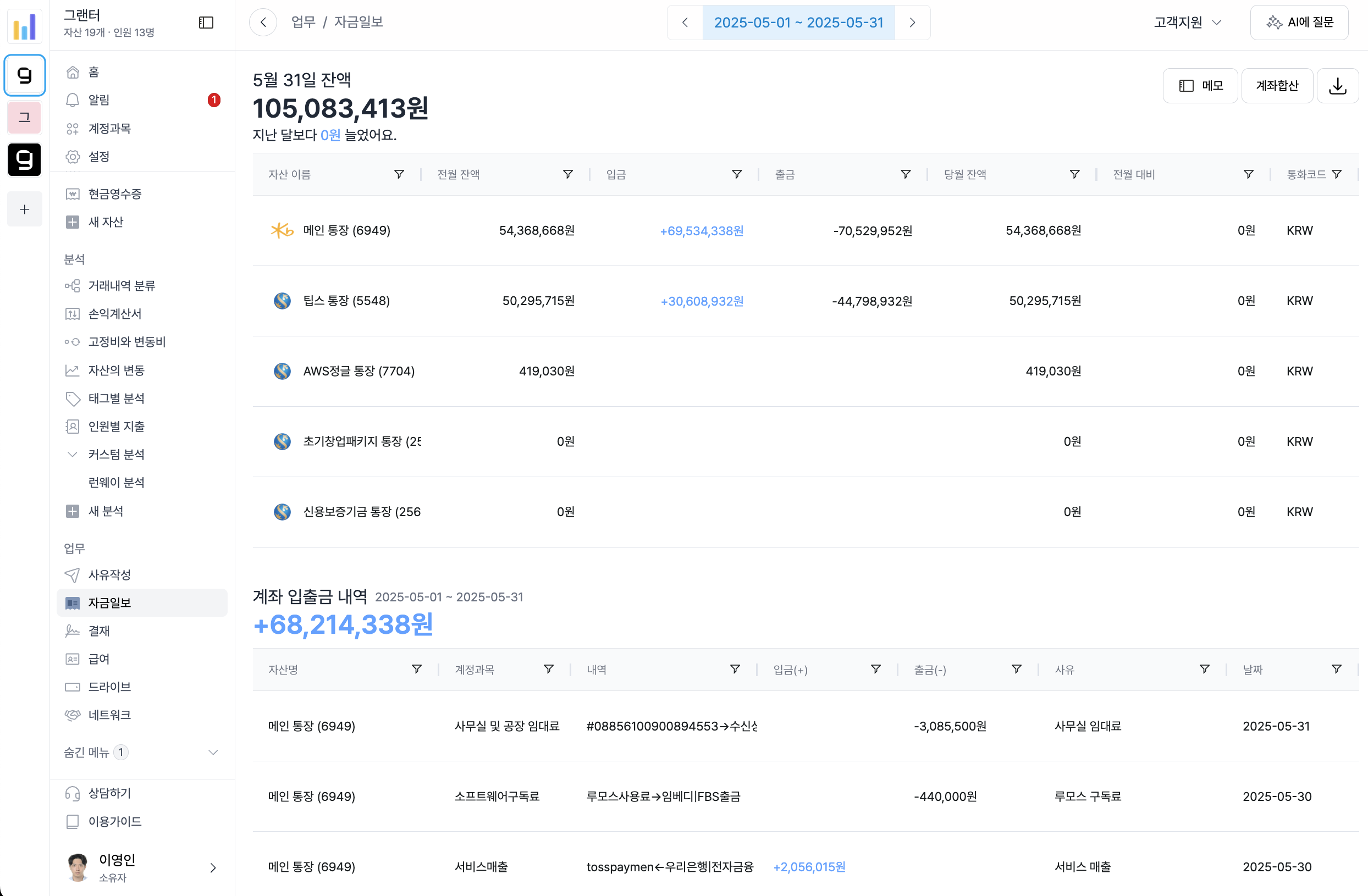 다음은 그랜터의 ‘자금일보’ 화면에 대한 설명 가이드입니다. 이 화면은 기업의 자금 흐름을 일 단위로 집계해주는 핵심 보고서로, 계좌별 잔액, 입출금 내역, 카드 사용내역을 통합적으로 확인할 수 있습니다.