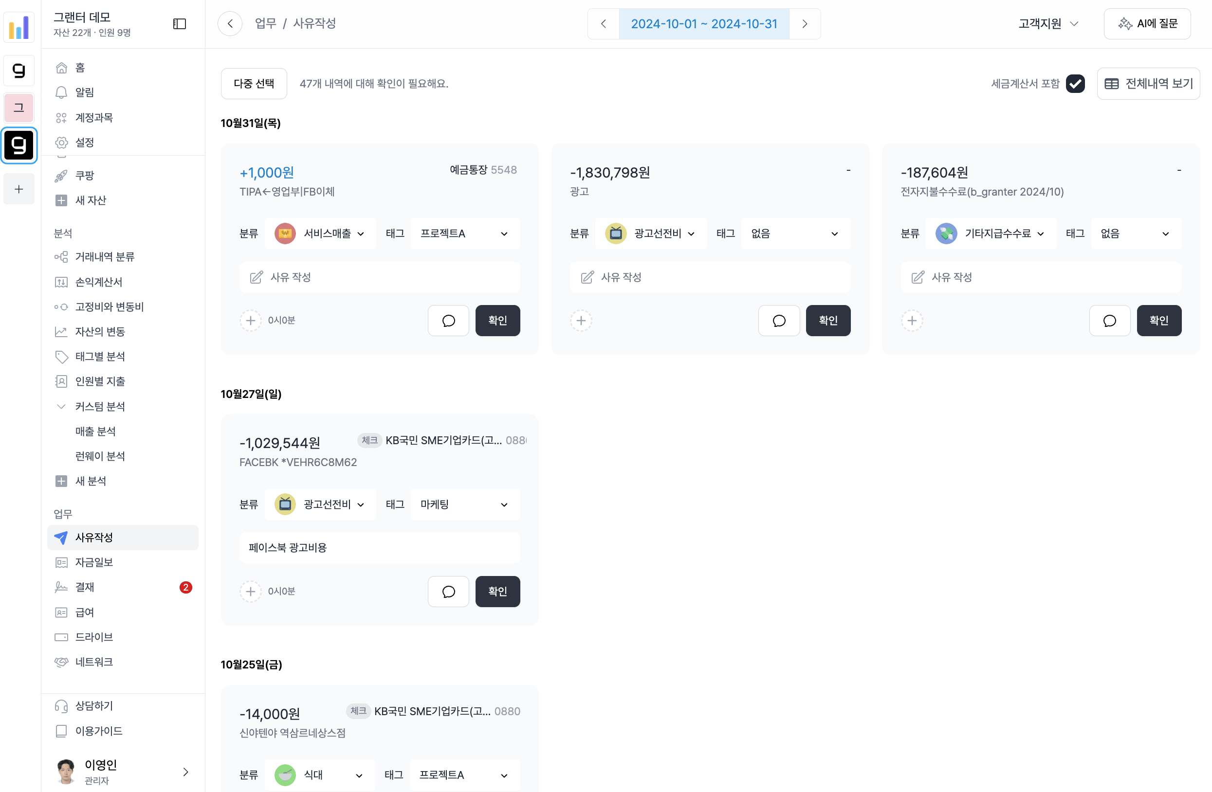 이 화면은 회계팀뿐 아니라 실무자 모두가 자산·지출에 책임 있는 사용자가 되도록 유도하는 내부 통제 핵심 도구입니다.