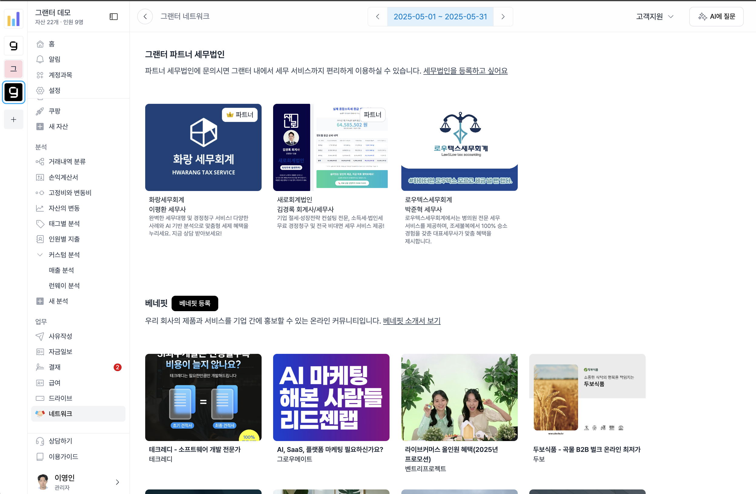 다음은 그랜터의 ‘네트워크’ 화면에 대한 설명 가이드입니다. 이 화면은 기업 고객이 외부 전문가, 파트너 서비스, 커뮤니티 혜택 등을 활용할 수 있도록 연결된 비즈니스 연계 플랫폼 역할을 합니다.