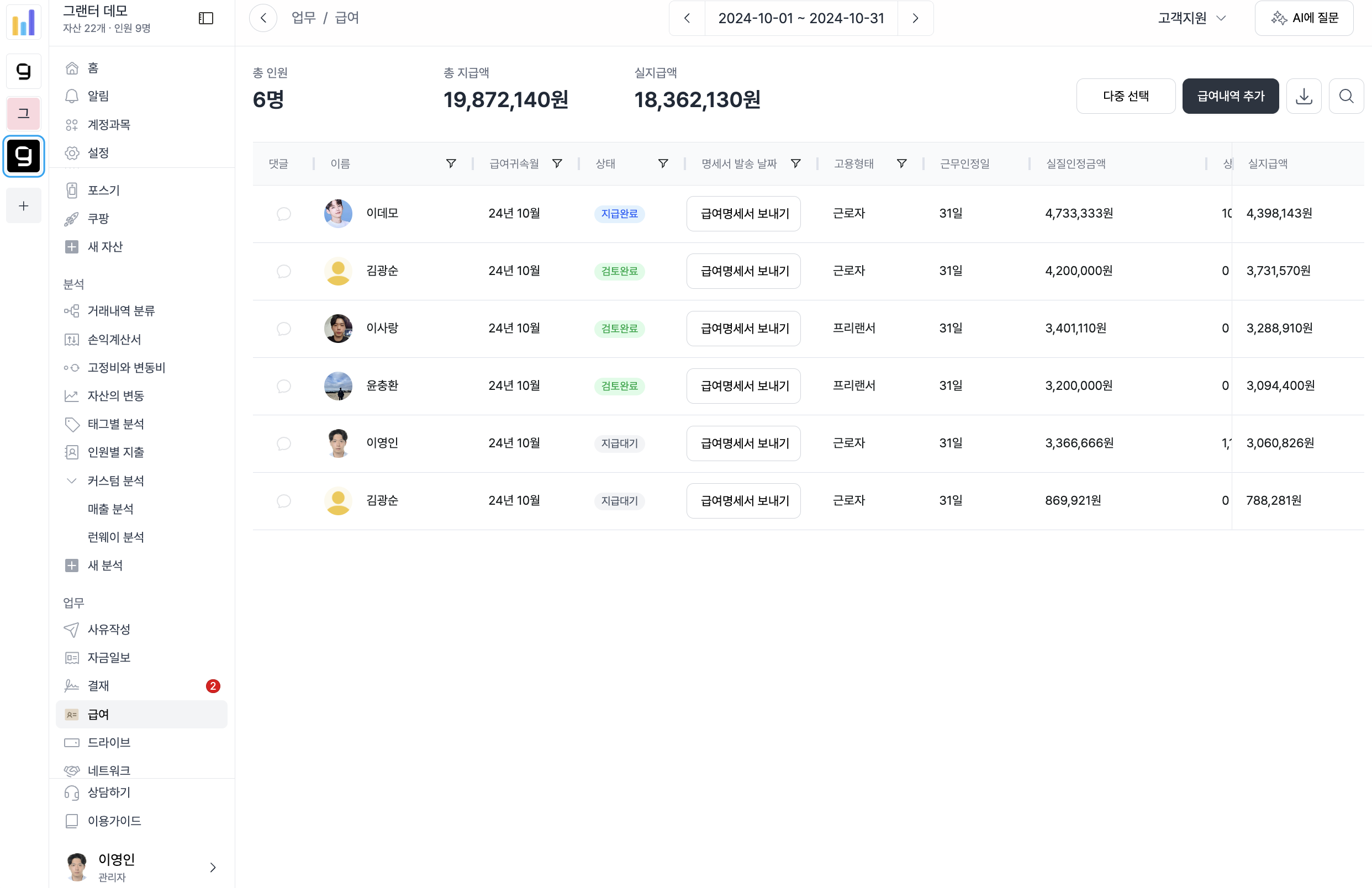 선택한 기간(예: 2024년 10월)에 대해 전체 인원 수, 총 지급액, 실지급액이 요약됩니다.